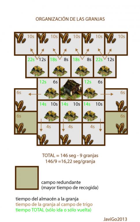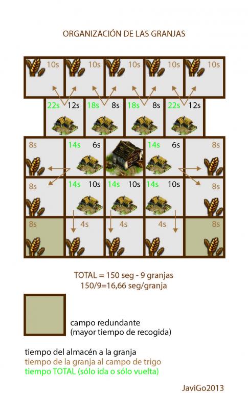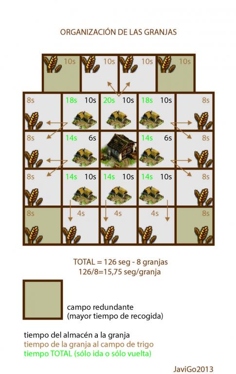 Mucho se ha escrito ya acerca de este tema, yo propongo gráficamente varias organizaciones distintas con sus respectivos tiempos y eficiencia por granja. He propuesto un modelo lineal, que tiene exactamente la misma eficiencia que el "típico" cuadrado de 5 casillas, y que además nos brinda la posibilidad de poner otros edificios que no necesiten campos de trigo alrededor, con unos buenos tiempos, lo único que no tiene campos redundantes para cuando se nos caigan. Por supuesto estos esquemas no son para su utilización con silos.